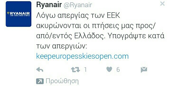 Για παράδειγμα, η «Ryanair» ενημέρωνε χτες τους επιβάτες της για την απεργία στην Ελλάδα και με άλλο μήνυμά της στο «Twitter» (και μάλιστα στα ελληνικά) ζητούσε να υπογράψουν οι δυσαρεστημένοι επιβάτες την ηλεκτρονική πλατφόρμα που έχει συστήσει για την απαγόρευση των απεργιακών κινητοποιήσεων των ελεγκτών εναέριας κυκλοφορίας σε όλη την Ευρώπη! Η συγκεκριμένη πλατφόρμα φτιάχθηκε από την εταιρεία για να επιτεθεί κατά βάση στους εργαζόμενους στα γαλλικά αεροδρόμια και τις απεργιακές τους κινητοποιήσεις.