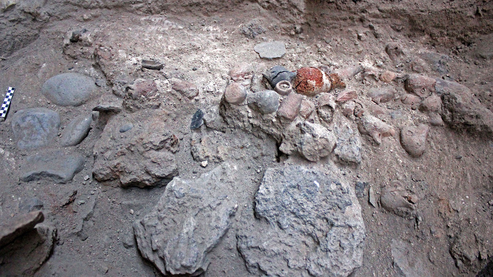 Στη βάση της εσχάρας, ανάμικτα με κέρατα, βρέθηκαν λίθινα εργαλεία και σκεύη (Πηγή: ΥΠΠΟΑ)