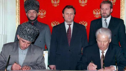 Ο Πρόεδρος της Ρωσίας, Μπόρις Γιέλτσιν, και ο ηγέτης της Τσετσενίας, Ασλάν Μασχάντοφ, υπογράφουν την ανεφάρμοστη, όπως αποδείχτηκε, συμφωνία για τον τερματισμό των συγκρούσεων.