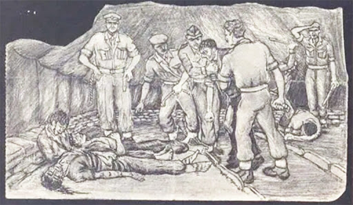 Οι κρατούμενοι μετά προχώρησαν προς τη θάλασσα, απ’ όπου εμφανίστηκε ένα περιπολικό σκάφος, που άρχισε να βάλει ενάντιά τους. Οι φρουροί διέταξαν τους κρατούμενους να καθίσουν κάτω και τότε ρίχτηκαν πάνω τους με τα ρόπαλα. Τρεις αεροπόρους κρατούμενους τους σκότωσαν με τον πιο άγριο τρόπο και έριξαν τα πτώματά τους στη θάλασσα. Οι δήμιοι διέδωσαν ότι πνίχτηκαν μόνοι τους.